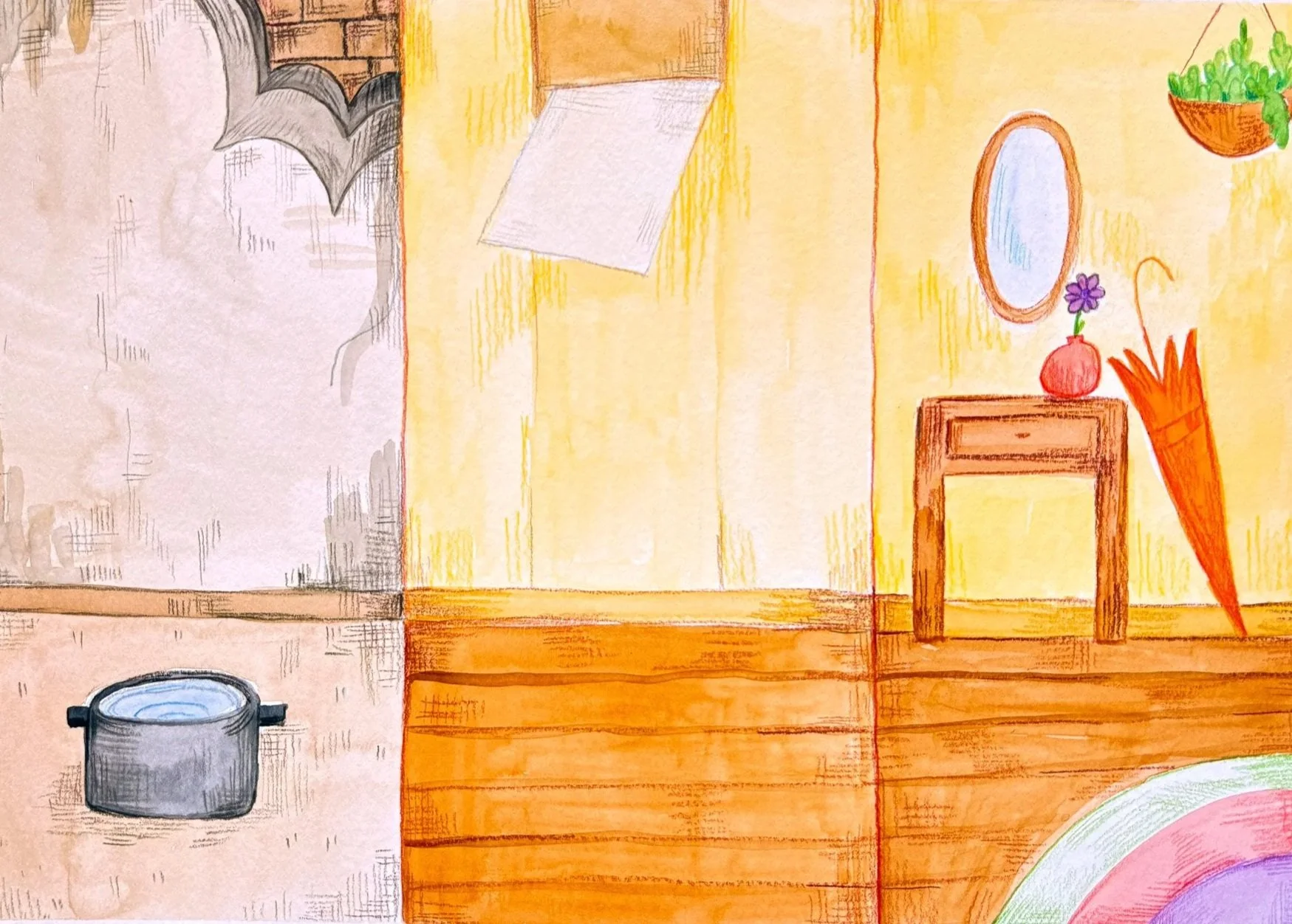 This was a personal project, a book with no words, made with watercolor and colored pencils, this is suppose to be the first version of the book.